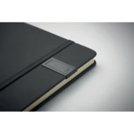 Notes A5 w twardej oprawie, wykonany w 58% z poliestru pochodzącego z recyklingu i w 42% z poliuretanu, z wbudowaną pamięcią USB 16 GB. Oprawiony w etui. 160 stron w linie z papieru z recyklingu (80 arkuszy). Dopasowany elastyczny pasek i tasiemka do oznaczania stron. FSC®-certified | FSC MIX CREDIT, P7.1, FSC-C213206