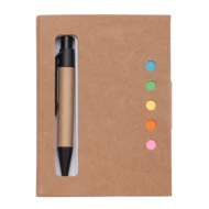 Mini notes w okładce z papieru o gramaturze 500 g/m2. Zawiera 100 białych gładkich kartek (80 g/m2) o wymiarze 78x107 mm, 5x25 szt. karteczek samoprzylepnych (80 g/m2) o wymiarze 12x45 mm oraz kartonowy mini-długopis (87x10x12 mm) z plastikowymi elementami. Wkład w kolorze niebieskim. Rozmiar kieszonkowy.