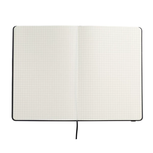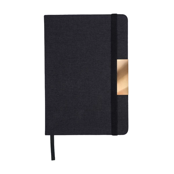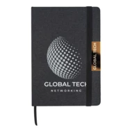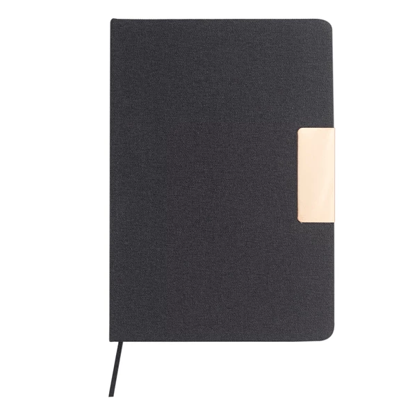 Notes A5 w twardej oprawie z materiału RPET z elastyczną gumką chroniącą wnętrze. 80 kartek w kratkę (papier 70 g/m2). Notes ozdobiony jest błyszczącym elementem w kolorze złotym.