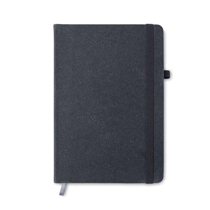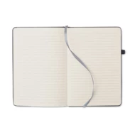 Notatnik A5 z okładką wykonaną w 70% ze skóry pochodzącej z recyklingu i w 30% z lateksowego PU. Obwoluta. 160 stron w linie na papierze z recyklingu (80 kartek). Dopasowany elastyczny pasek i uchwyt na długopis.