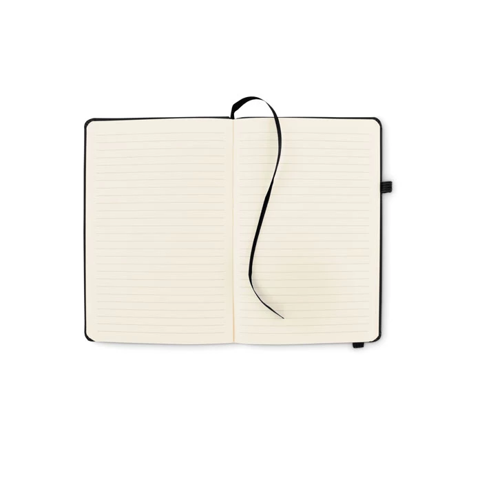 Notatnik A5 z okładką wykonaną w 70% ze skóry pochodzącej z recyklingu i w 30% z lateksowego PU. Obwoluta. 192 stron w linie na papierze z recyklingu (96 arkuszy). Dopasowany elastyczny bawełniany pasek i uchwyt na długopis.
