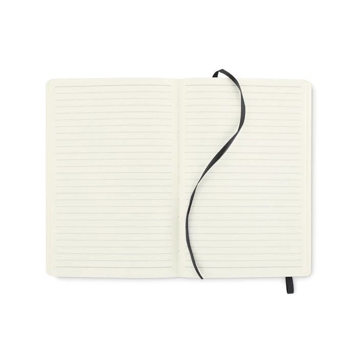 Notatnik A5 z miękką okładką z PU z recyklingu. 160 stron w linie z papieru z recyklingu (80 kartek). Dopasowany elastyczna opaska i zakładka z tasiemki. Rozszerzana kieszeń wewnętrzna z tyłu. FSC®-certified | FSC MIX CREDIT, P7.1, FSC-C213206