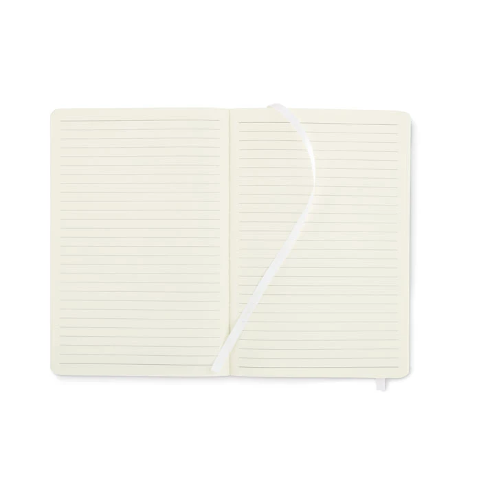 Notatnik A5 z miękką okładką z PU z recyklingu. 160 stron w linie z papieru z recyklingu (80 kartek). Dopasowany elastyczna opaska i zakładka z tasiemki. Rozszerzana kieszeń wewnętrzna z tyłu. FSC®-certified | FSC MIX CREDIT, P7.1, FSC-C213206