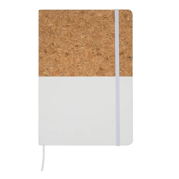 Stylowy notes w twardej oprawie łączącej naturalny korek z eleganckim PU. Rozmiar biurkowy. 80 kartek, gramatura papieru 70 g/m2. Zamykany elastyczną taśmą.