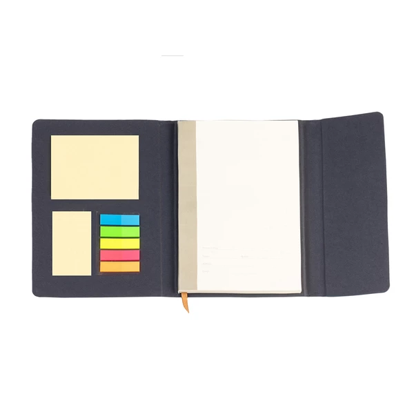 70 kartkowy notes w linie, w twardej oprawie. Zamykany magnetyczną listwą. Zawiera dwa komplety 25 żółtych karteczek samoprzylepnych w rozmiarach 100x76 mm i 45x72 mm oraz 25 samoprzylepnych foliowych zakładek indeksujących po 5 w każdym kolorze.