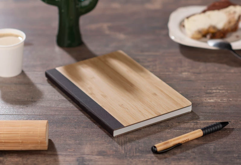 Oryginalny i wyjątkowy notes formatu A5. Okładka wykonana z bambusa zakończona na brzegu brązową taśmą, która stanowi ciekawy i ozdobny element. Kartki w notesie wyprodukowane zostały z papieru kamiennego. Taki papier jest wyjątkowo odporny na rozdarcia oraz na wilgoć. Posiada 80 gładkich kartek. Zapakowany w woreczek biodegradowalny.
