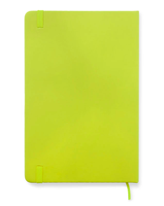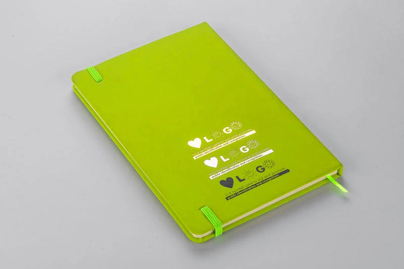 Gustowny notes A5 z kolorową gumką wykonany z materiału skóropodobnego (PU). Notes zawiera 80 kartek ecru w linie koloru pomarańczowego. Logo nadrukujemy na okładce.