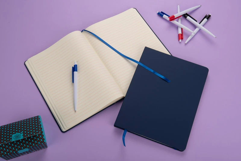 Gustowny notes VITAL B5 z kolorową gumką wykonany z materiału skóropodobnego (PU). Notes zawiera 80 kartek ecru w linie koloru pomarańczowego.
