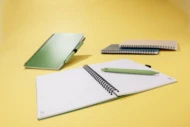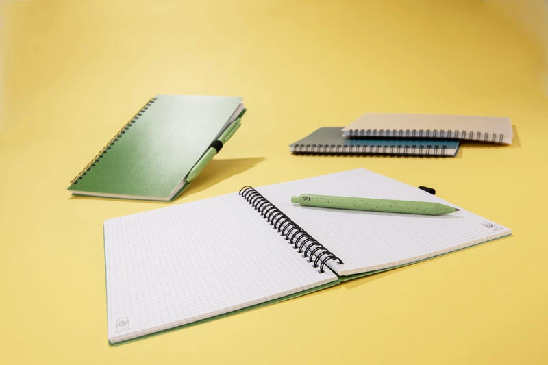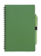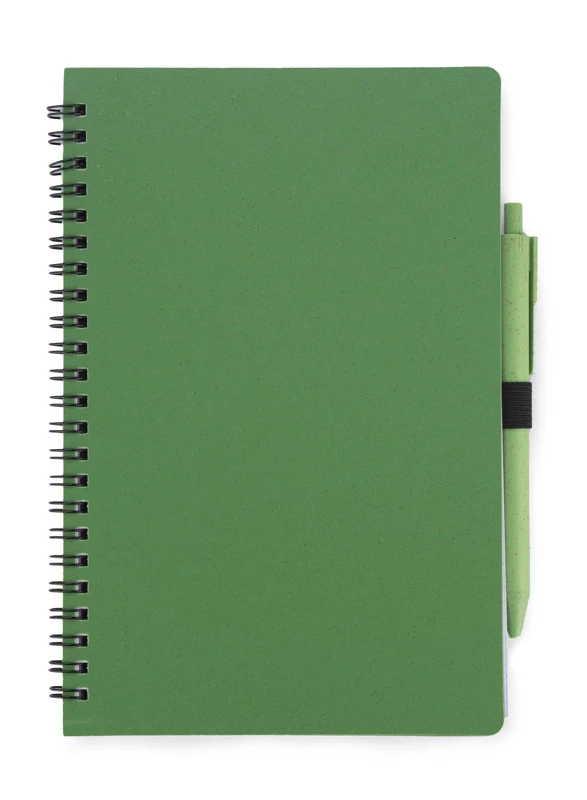 Notes TRESA z długopisem, kolorystyką dopasowanym do okładki. Długopis oraz okładka notesu wykonane są ze słomy pszenicznej. Notes na spirali, posiada 70 kartek w kratkę wykonanych z recyklingowanego papieru. Format A5. Wkład w długopisie w kolorze niebieskim.