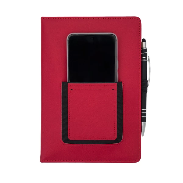 Notes A5 wyposażony w elastyczną kieszeń, która dopasowuje się do wielkości telefonu. Mniejsza kieszonka przeznaczona jest na wizytówki. Twarda oprawa z ekoskóry. 100 kartek w linię, gramatura 80 g/m2. Elastyczny uchwyt na długopis.