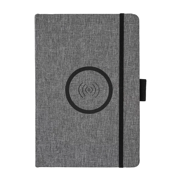 Notes A5 w twardej okładce, wykonanej z materiału RPET, z wbudowaną ładowarką indukcyjną (15W). 80 kartek w kratkę, gramatura 70 g/m2. W zestawie kabel USB.