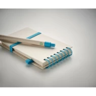 Zeszyt A6 70 kartek (w 70% z kartonów po mleku z recyklingu i w 30% z papieru z recyklingu). Pasujący długopis z przyciskiem. Niebieski tusz. Opaska zamykająca i uchwyt na długopis z gumki.
