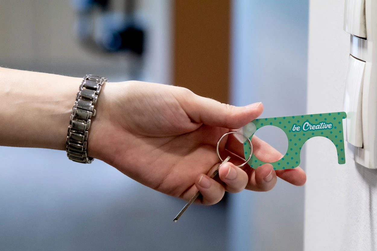 Praktyczny klucz higieniczny z akrylu z personalizowaną grafiką, do naciskania przycisków i otwierania drzwi bez bezpośredniego kontaktu. Może być również używany jako brelok. Cena obejmuje nadruk UV LED z jednej strony. Min. ilość: 250 szt.