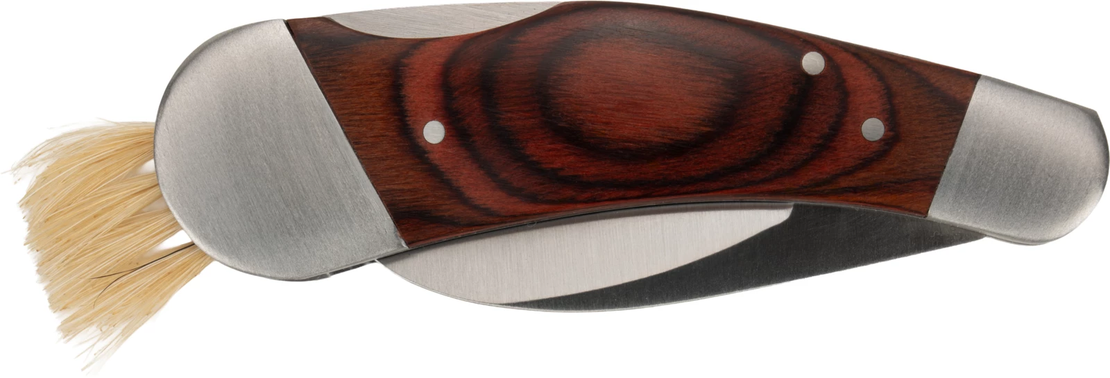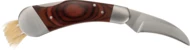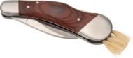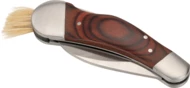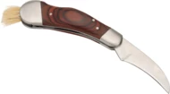 Nóż do zbierania grzybów, wykonany ze stali nierdzewnej i drewna, wyposażony w pędzelek do czyszczenia grzybów.