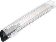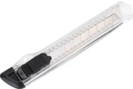 Transparentny nóż do kartonu z kolorową końcówką i łamanym ostrzem, w plastikowej obudowie.