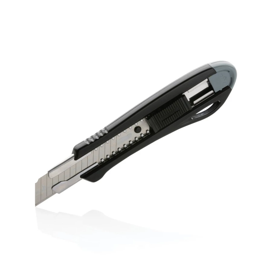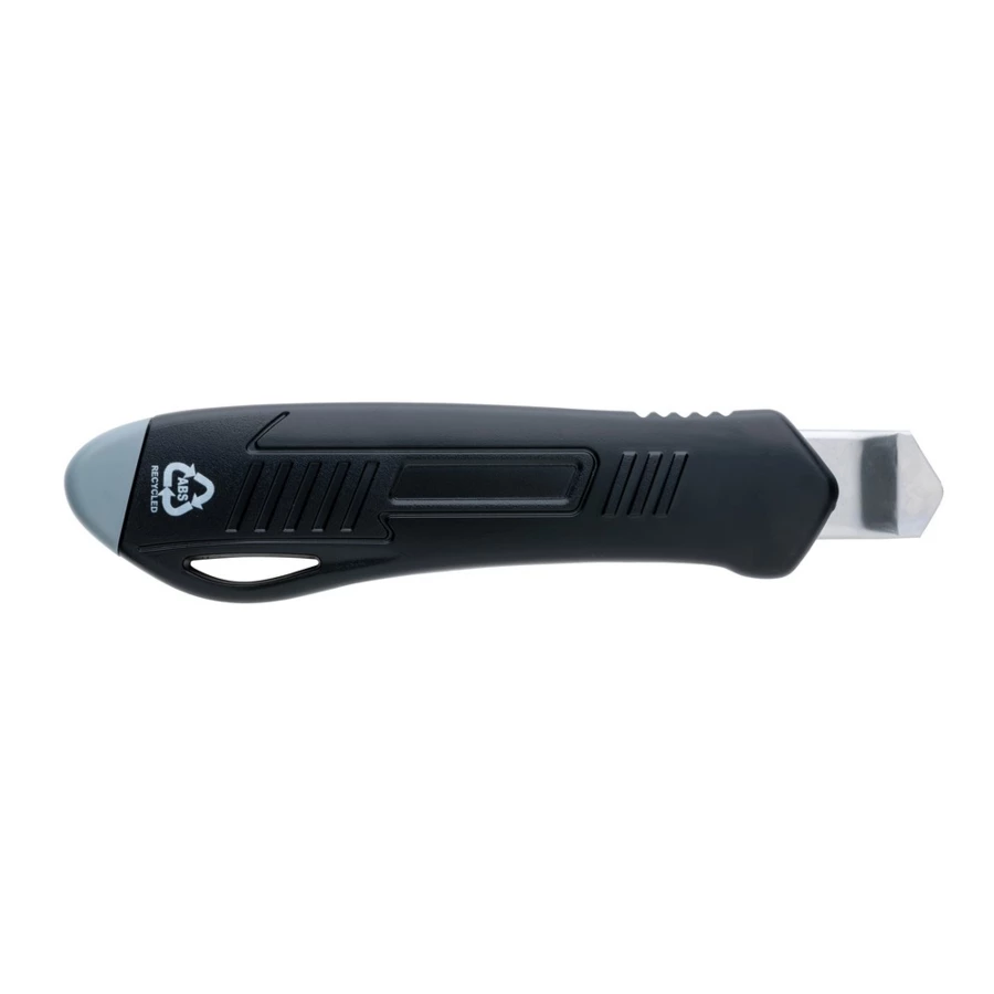 Nóż do tapet, wymienne ostrza, wykonany z ABS z recyklingu z certyfikatem RCS, łamane ostrze ze stali nierdzewnej, całkowita zawartość materiałów z recyklingu obliczona na podstawie wagi przedmiotu: 36%, produkt jest dostarczany z 1 ostrzem wewnątrz noża oraz 2 ostrzami zapasowymi, w pudełku papieru kraftowego z certyfikatem FSC® mix, ślad węglowy produktu: 0,5 kg CO2