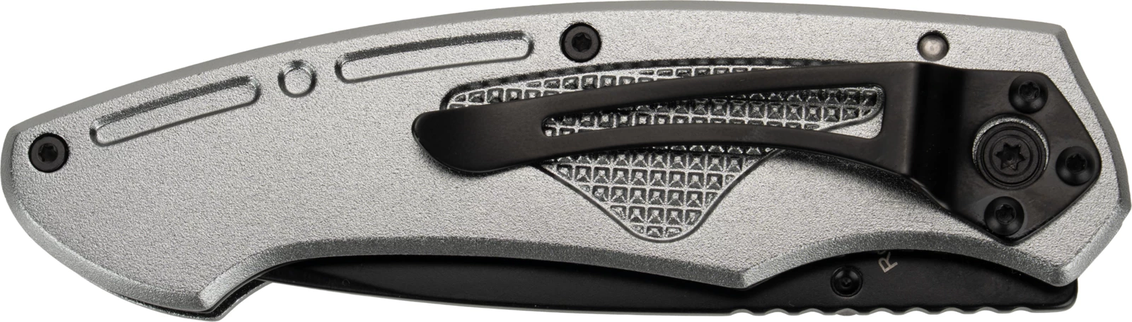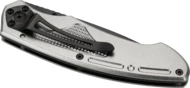 Nóż kieszonkowy wykonany ze stali nierdzewnej z aluminiową rękojeścią i klipsem do mocowania na pasku.
