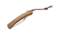 Wykonany z naturalnego drewna uchwyt wraz z rzemykowym paskiem zapewniają świetną ergonomię użytkowania. Zastosowana tylna blokada zapobiegnie niezaplanowanemu złożeniu się ostrza.