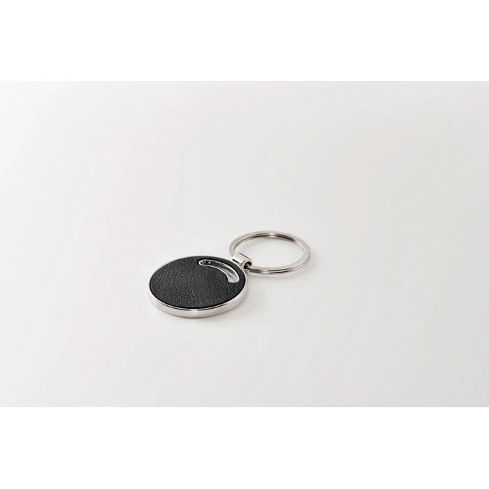 Okrągły metalowy brelok z wkładką ze skóry PU pochodzącej z recyklingu.