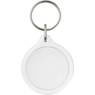 Okrągły breloczek I7 z metalowym pękiem na klucze. Metalowy pierścień cechuje płaski profil, który idealnie nadaje się do wysyłek. Średnica wkładu do druku: 3,3 cm.