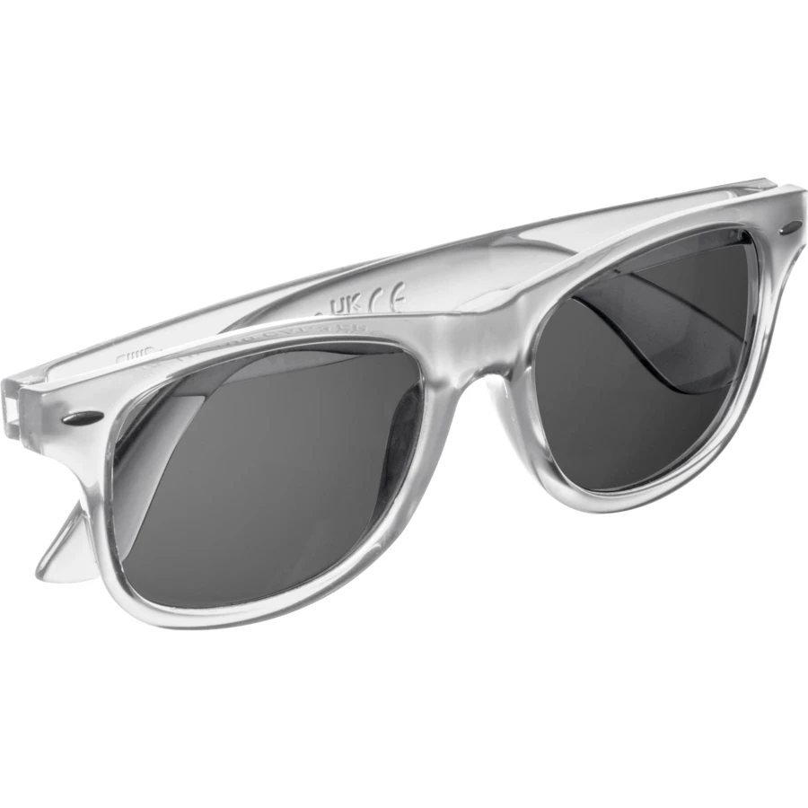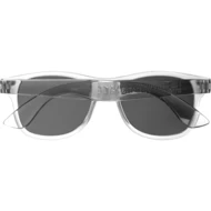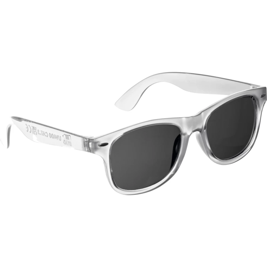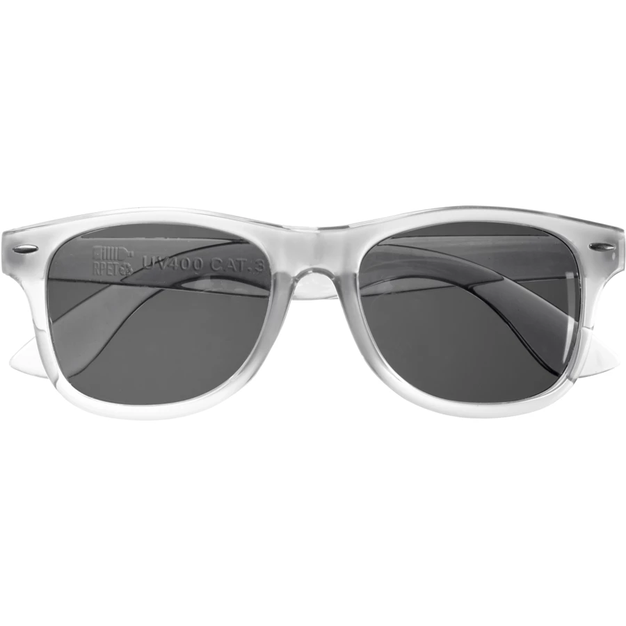 Okulary przeciwsłoneczne, wykonane z materiału RPET, z przezroczystymi zausznikami. Ochrona przed słońcem UV400, filtr 3 kategorii.