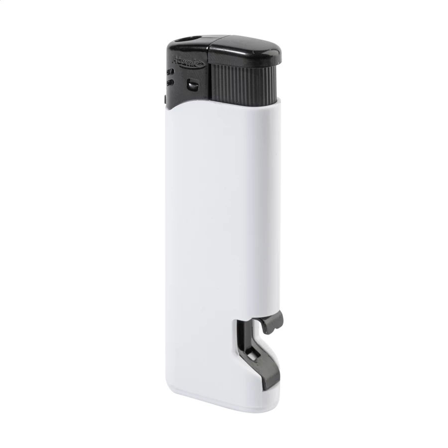 Plastikowa zapalniczka piezoelektryczna z możliwością ponownego napełnienia i otwieraczem do butelek. Zabezpieczona przed dziećmi. Dostarczana z poziomem gazu ok. 80%. Dostępna tylko w pełnych kartonach eksportowych (wielokrotność 500 sztuk)!