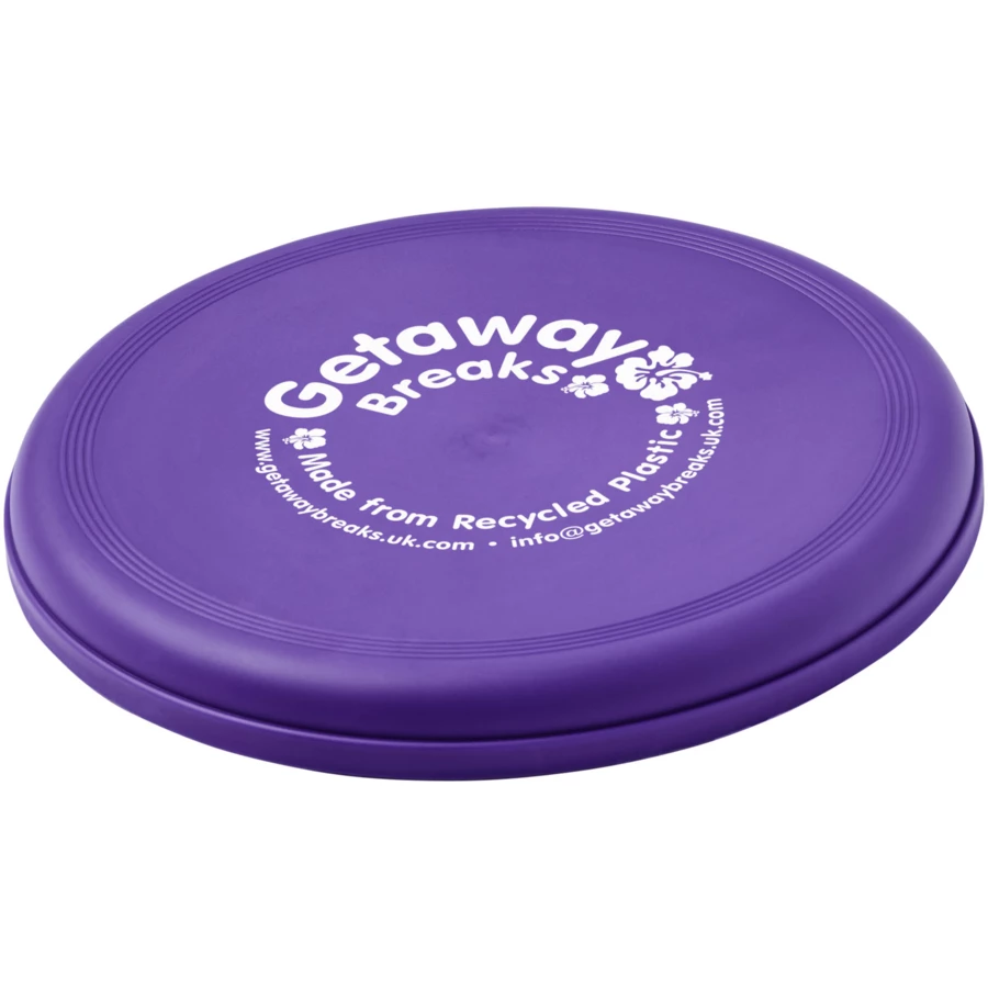 Frisbee wykonane w 100% z tworzyw sztucznych pochodzących z recyklingu, łączy zabawny pomysł promocyjny ze sprawdzonymi certyfikatami zrównoważonego rozwoju. Wykonane w Wielkiej Brytanii i zgodne ze standardem EN72. Ze względu na charakter materiału pochodzącego z recyklingu frisbee może mieć plamki. Nieodpowiednie dla dzieci poniżej trzeciego roku życia. Średnica: 23 cm.