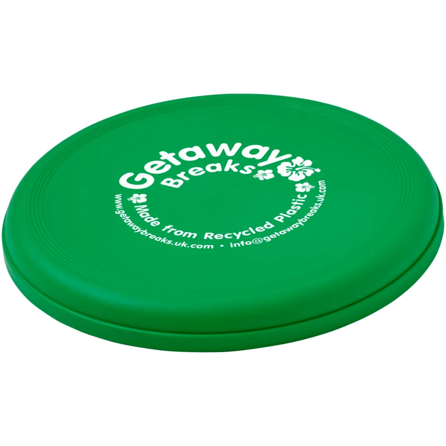 Frisbee made from 100% recycled plastic, combining a fun promotional idea with strong sustainable credentials. Made in the UK and compliant with EN72. The frisbee may have a speckled finish due to the nature of the recycled material. Diameter: 23 cm.