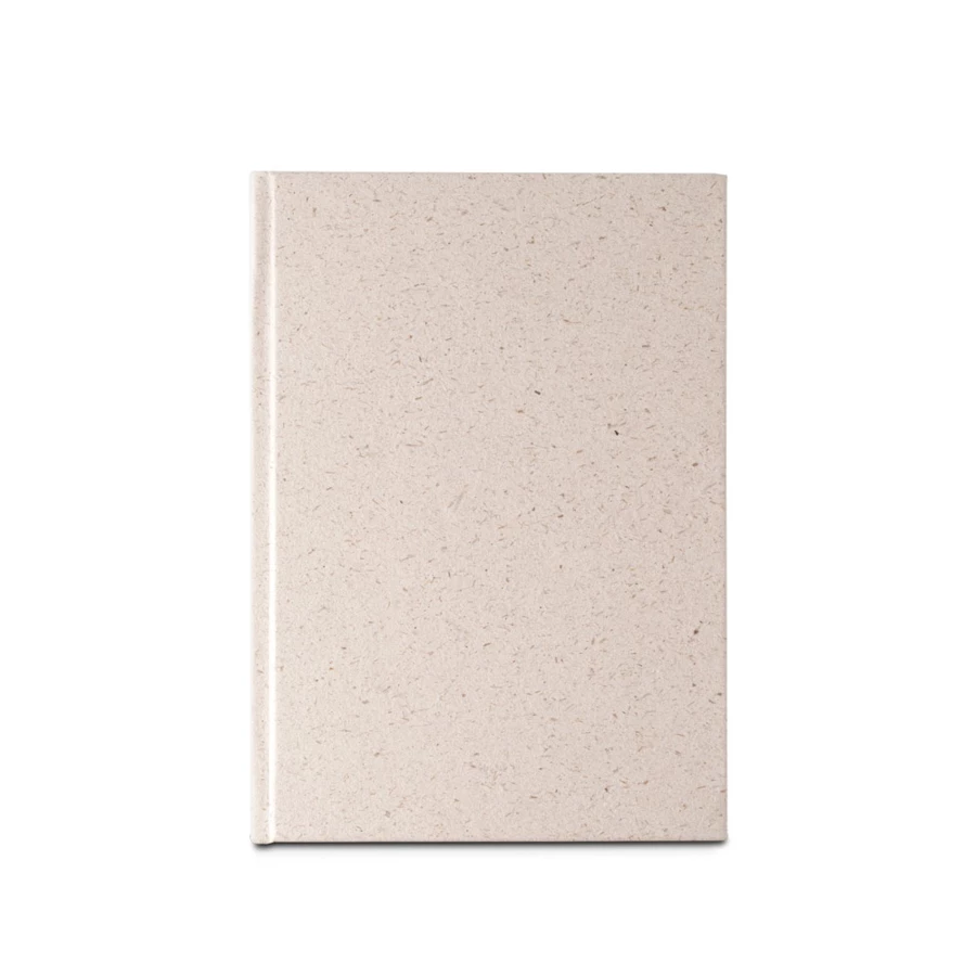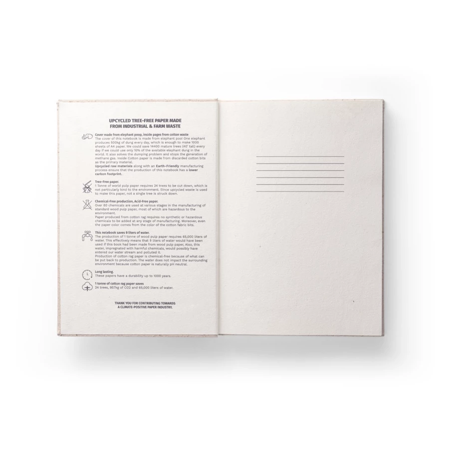 Notatnik A5 z twardą okładką wykonaną z organicznej masy, z rośliny zwanej "trawą słoniową" (80%) i odpadów bawełnianych (20%). Papier wewnętrzny wykonany jest z odpadów bawełnianych (100%) i jest bardzo trwały. Zawiera 120 stron w linie oraz papierową opaskę z grafiką. W procesie produkcji tego notatnika nie powstały żadne odpady, nie użyto żadnych chemikaliów ani drzew. Ponieważ produkt jest wykonany z naturalnych materiałów, kolor produktu oraz wynik drukowania mogą się różnić w zależności od produktu. 140 x 200 mm