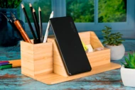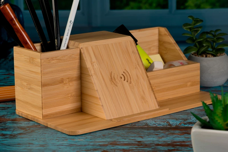 Organizer na biurko wykonany z bambusa, z wbudowaną ładowarką indukcyjną o mocy 10 wat i dwoma przegródkami na przybory biurowe.