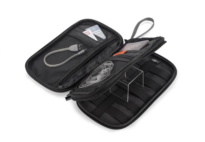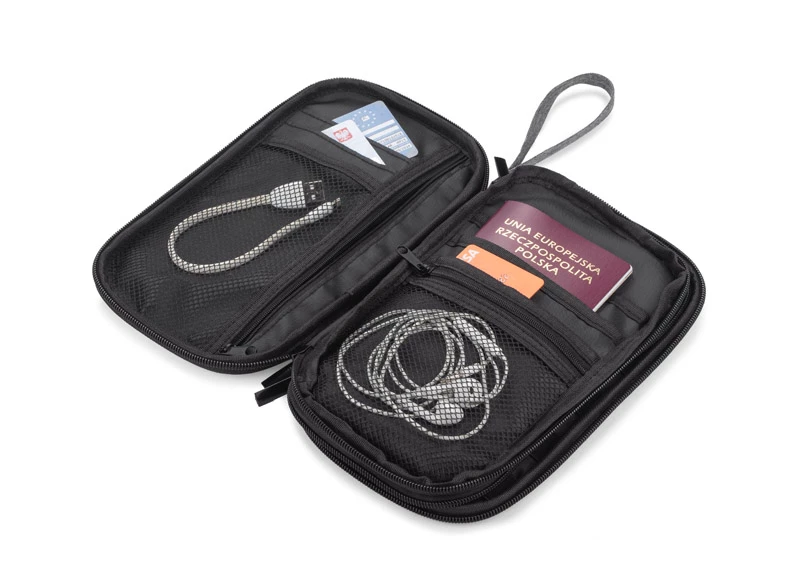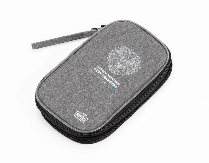 Portfel podróżny CHILLGO posiada wiele różnej wielkości przegródek. Zapięcie na zamek z uchwytem ułatwia trzymanie portfela. Wyposażony jest on w folię zabezpieczającą przed kradzieżą danych z kart kredytowych, blokując sygnał RFID. Wykonany z poliestru 300D.