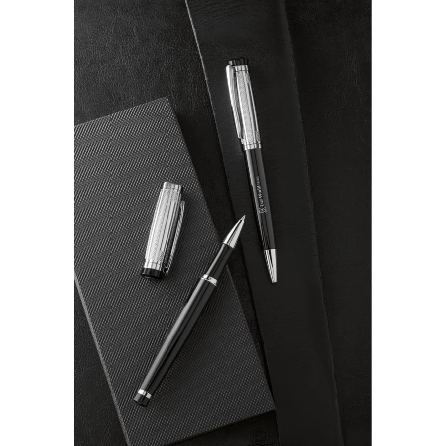 Zestaw - metalowe pióro kulkowe i długopis z klipsem. Niebieski tusz. Dostarczany w wyściełanym pudełku upominkowym z zamknięciem na magnes. Długopis: ø13 x 136 mm | Roller: ø13 x 135 mm | Pudełko: 192 x 34 x 85 mm