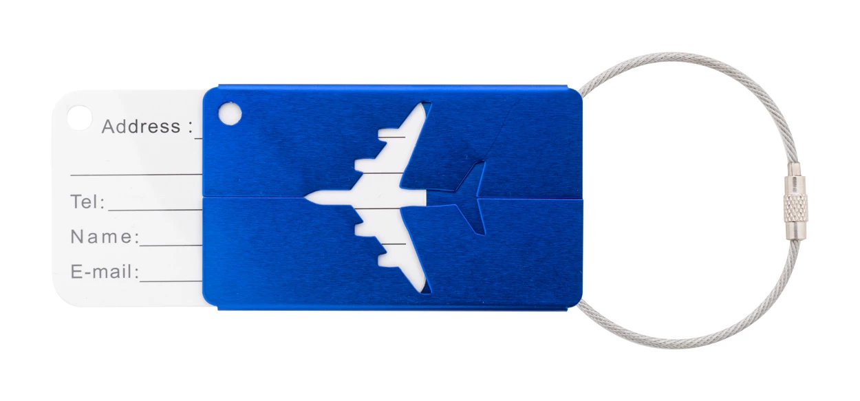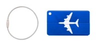 Aluminiowa zawieszka bagażowa z motywem samolotu i metalową linką.