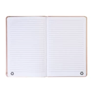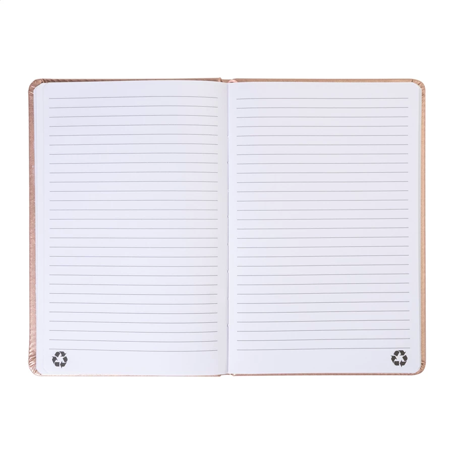 Notes w metalicznej oprawie z recyklingowanej skóry PU, ze 100 kartkami w linie z papieru pochodzącego z recyklingu. Z zakładką w pasującym kolorze i gumką. Format A5.