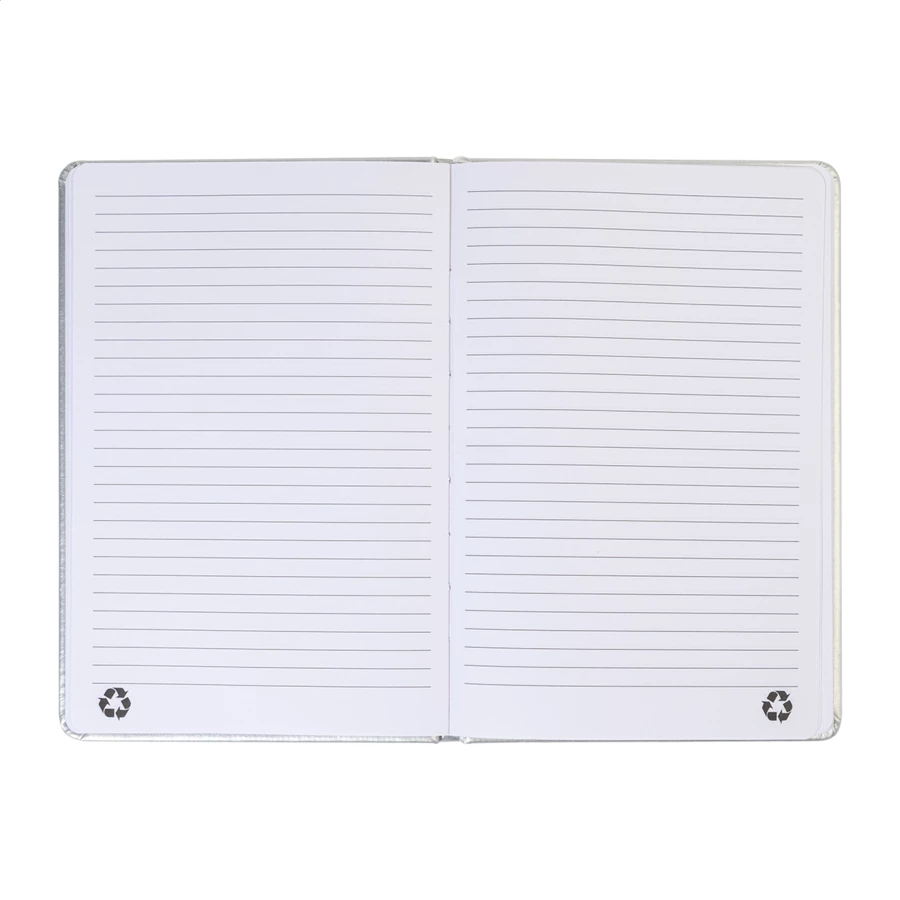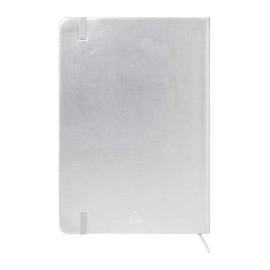 Notes w metalicznej oprawie z recyklingowanej skóry PU, ze 100 kartkami w linie z papieru pochodzącego z recyklingu. Z zakładką w pasującym kolorze i gumką. Format A5.