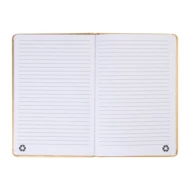 Notes w metalicznej oprawie z recyklingowanej skóry PU, ze 100 kartkami w linie z papieru pochodzącego z recyklingu. Z zakładką w pasującym kolorze i gumką. Format A5.