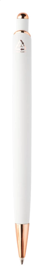Długopis wykonany z aluminium pochodzącego z recyklingu, z gumowanym wykończeniem i detalami w kolorze różowego złota. Ze specjalną powłoką pod grawer lustrzany w kolorze różowego złota. Z niebieskim wkładem.