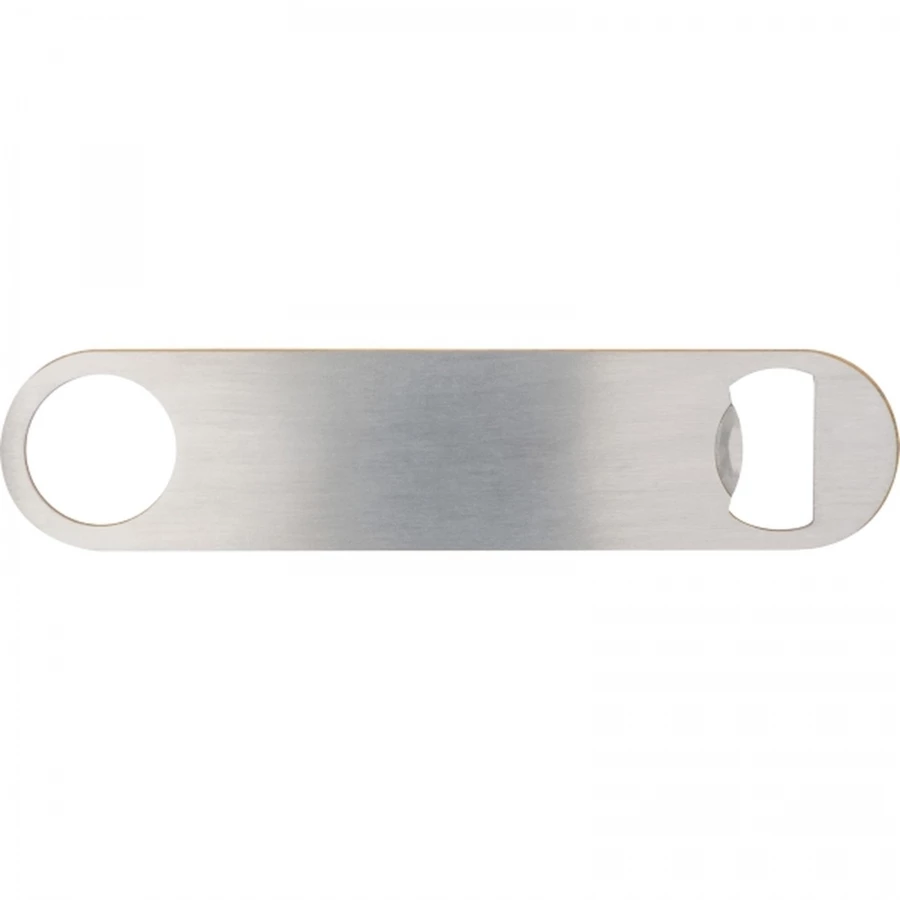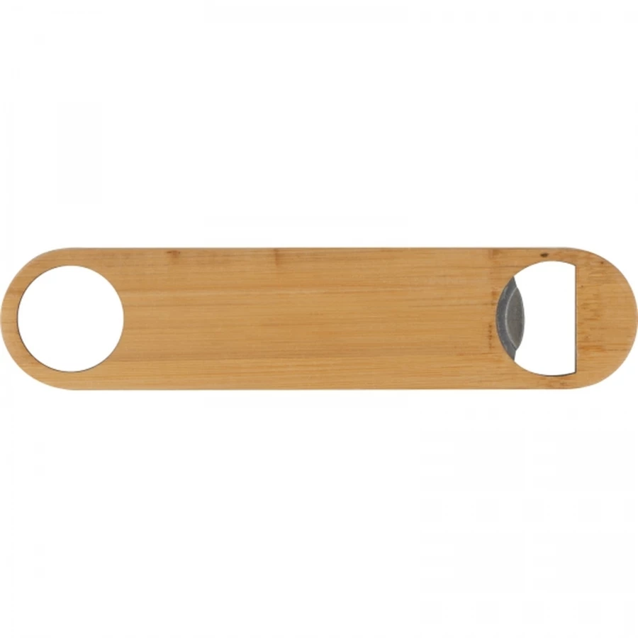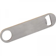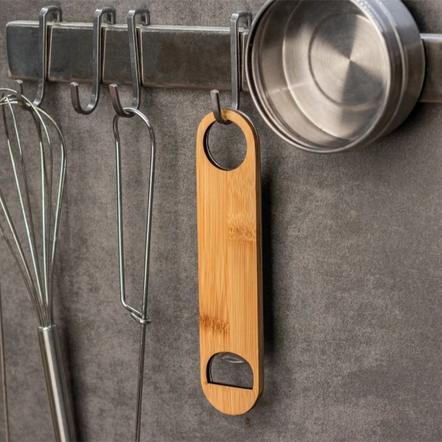 Otwieracz do butelek ze stali nierdzewnej z powierzchnią z drewna bambusowego.
