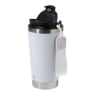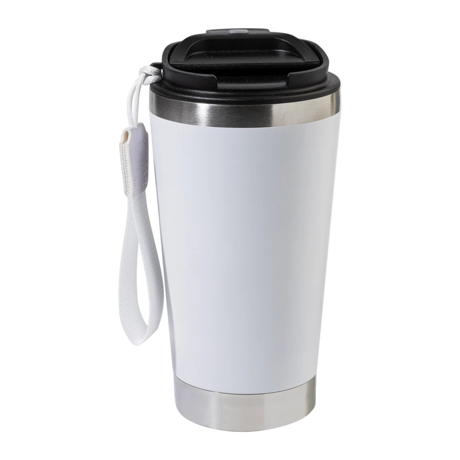 Kubek termiczny z podwójnymi ściankami, izolowany. Ze stali nierdzewnej pochodzącej z recyklingu, z pokrywką do picia z PP i paskiem do noszenia w pasującym kolorze. 430ml.