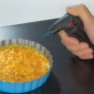 Wykonany z plastiku i metalu palnik cukierniczy do przygotowywania creme brulee, z regulacją płomienia.