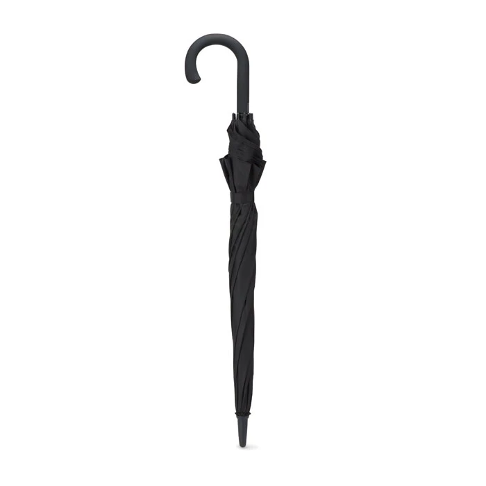 Elegancki 23 calowy parasol automatyczny odporny na działanie silnego wiatru wykonany z tkaniny 190T. Trzon czerniony, żebra wykonane z włókna szklanego, zakończenia plastikowe. Zakrzywiona rączka z gumowanego plastiku. Zapięcie manualne.