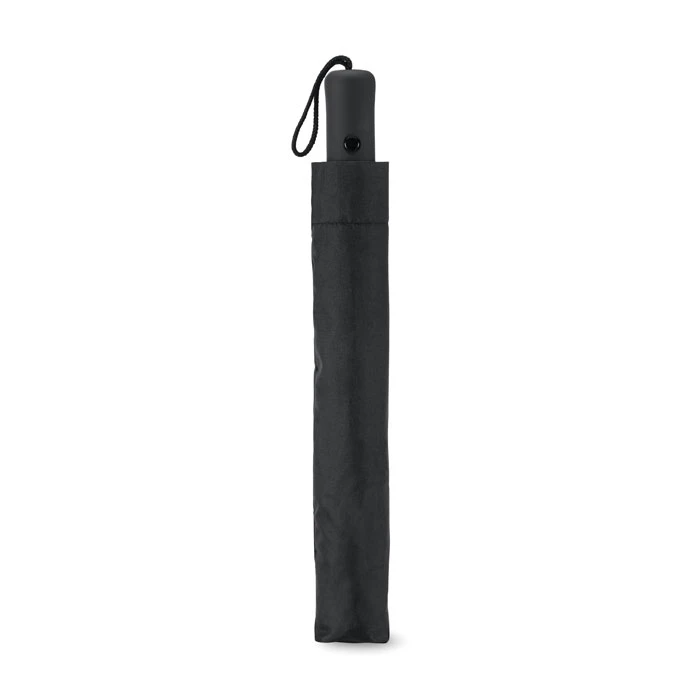 Parasol 21cali, otwierany automatycznie, składany na 2. Wykonany z wysokiej jakości poliestru pongee 190T, trzon, żebra i końcówki ocynkowane. Czarna gumowana rączka z ABS. Posiada dopasowane etui. Zamykany manualnie.