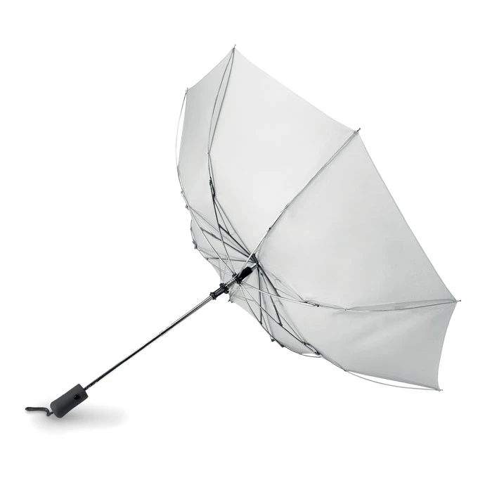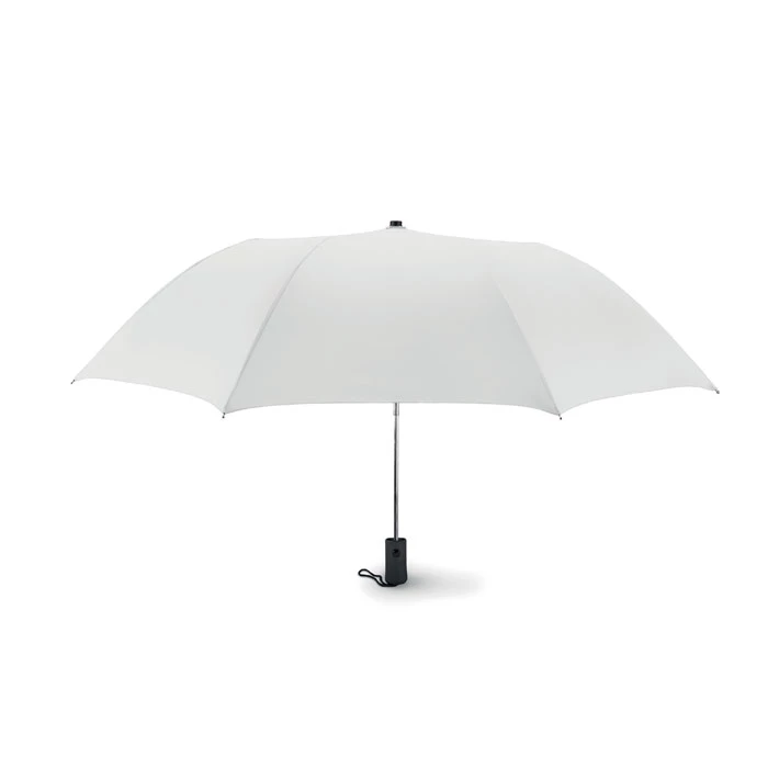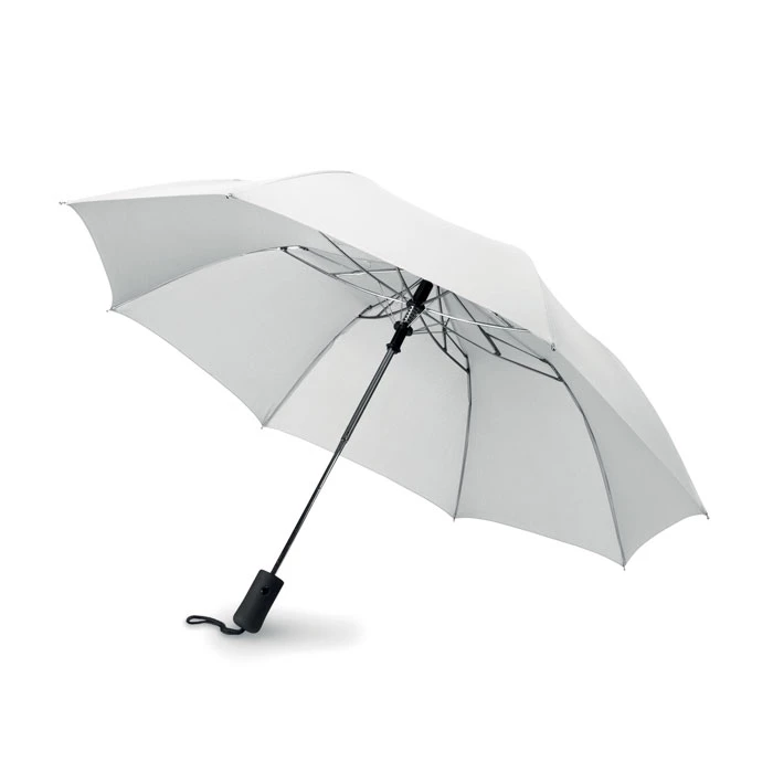 Parasol 21cali, otwierany automatycznie, składany na 2. Wykonany z wysokiej jakości poliestru pongee 190T, trzon, żebra i końcówki ocynkowane. Czarna gumowana rączka z ABS. Posiada dopasowane etui. Zamykany manualnie.