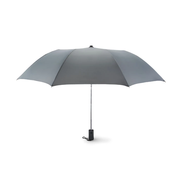 Parasol 21cali, otwierany automatycznie, składany na 2. Wykonany z wysokiej jakości poliestru pongee 190T, trzon, żebra i końcówki ocynkowane. Czarna gumowana rączka z ABS. Posiada dopasowane etui. Zamykany manualnie.