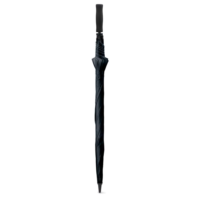 Parasol 30 cali, otwierany ręcznie, odporny na wiatr. Trzon i żebra z włókna szklanego, czarne plastikowe końcówki i szpic. Materiał: poliester 190T. Czarna, prosta rączka z EVA. Zamykany manualnie.