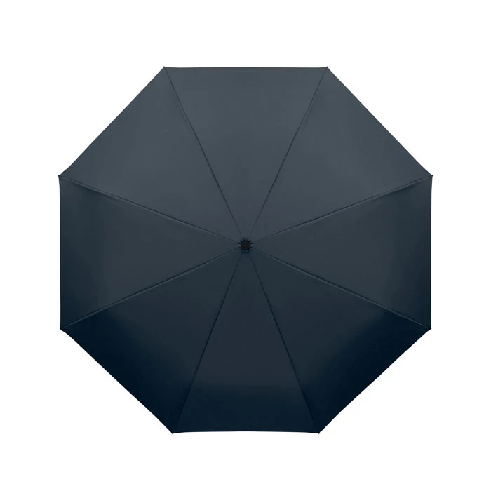 Składany 21-calowy wiatroodporny parasol z pełną czarną ramą z włókna szklanego z 2 sekcjami. Żebra z włókna szklanego. Panele pongee 190T RPET. Uchwyt w kształcie litery D z gumowym wykończeniem. Automatyczne otwieranie i zamykanie. W zestawie pokrowiec.