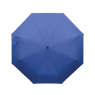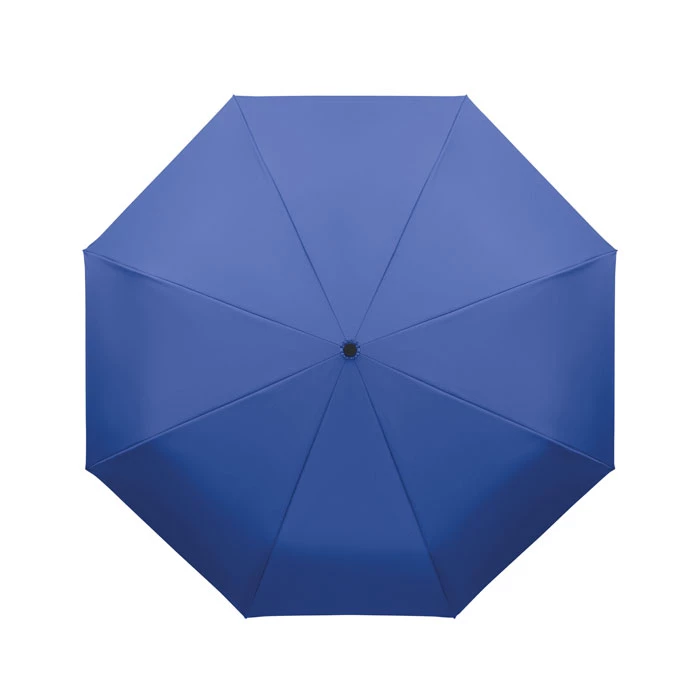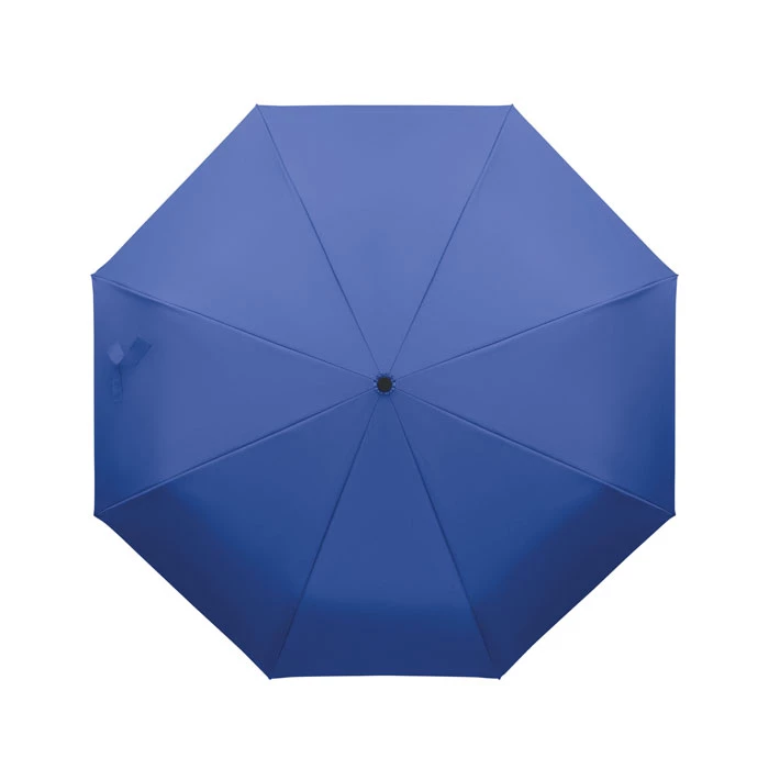Składany 21-calowy wiatroodporny parasol z pełną czarną ramą z włókna szklanego z 2 sekcjami. Żebra z włókna szklanego. Panele pongee 190T RPET. Uchwyt w kształcie litery D z gumowym wykończeniem. Automatyczne otwieranie i zamykanie. W zestawie pokrowiec.