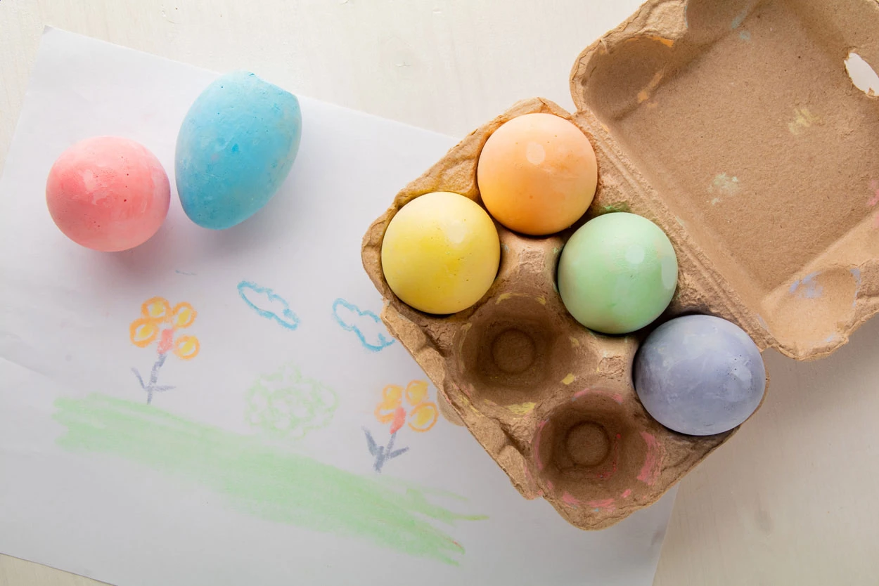 Zestaw 6 kolorowych jajek kredowych w kartonowym pudełku na jajka.