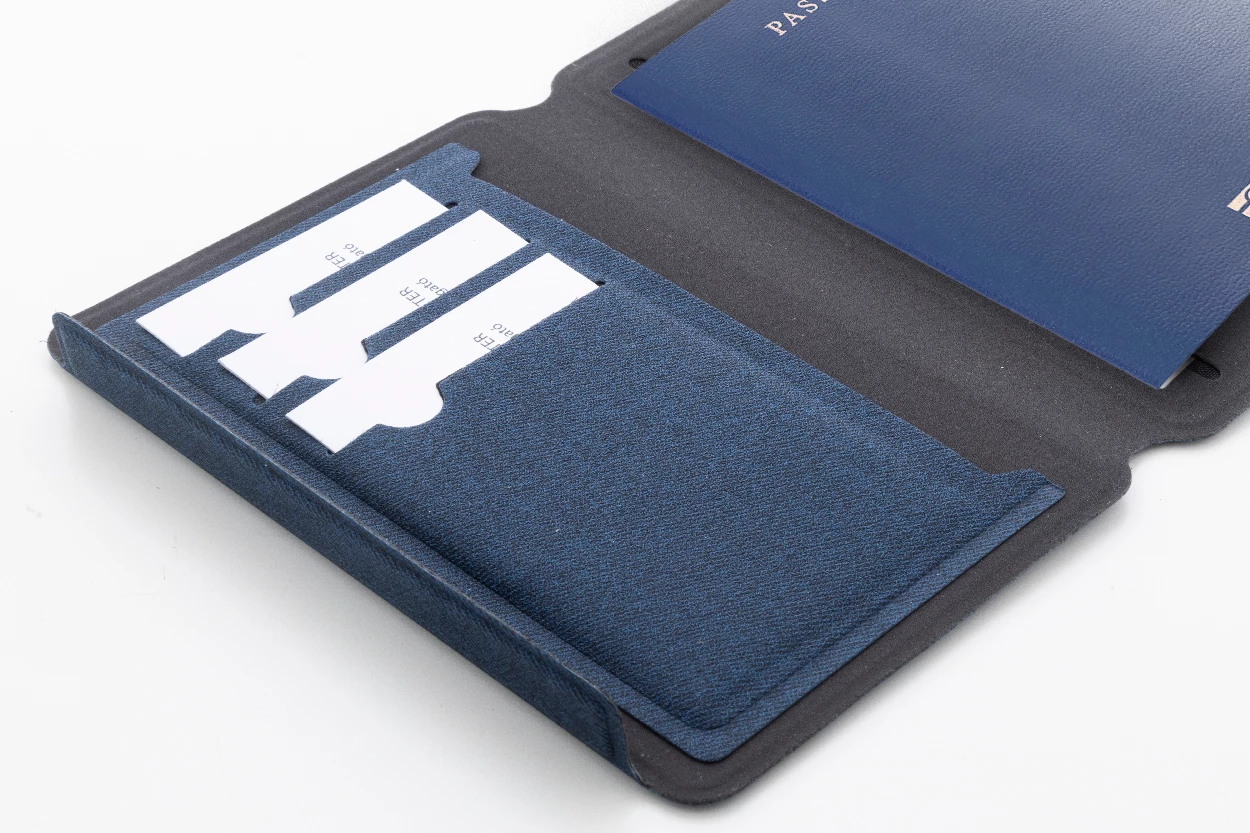 Etui na paszport wykonane z recyklingowanej skóry PU z wewnętrznymi kieszonkami na karty i magnetycznym zapięciem.