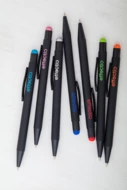 Aluminiowy długopis z końcówką do ekranów dotykowych i gumowanym wykończeniem. Posiada specjalną powłokę pod grawer lustrzany pasujący kolorystycznie do gumki.